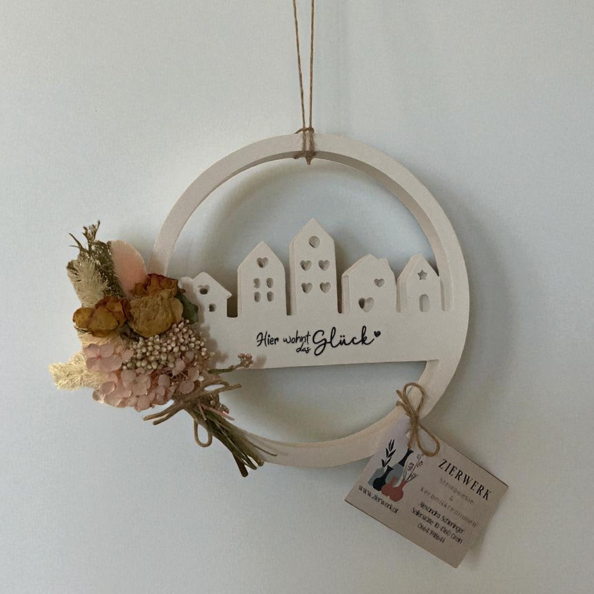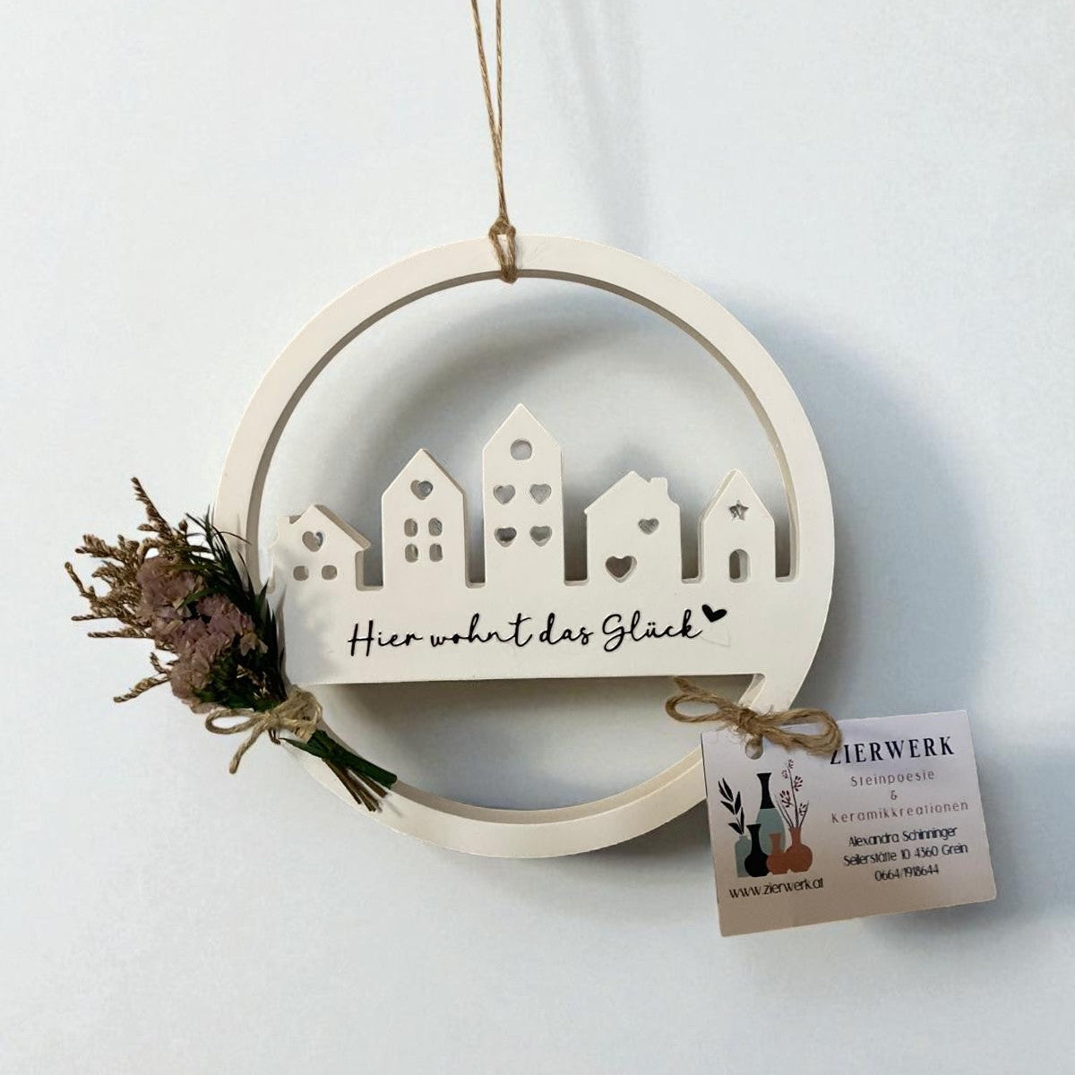 Der filigrane Keramikring mit den ausgestanzten Häuschen und dem Schriftzug „Hier wohnt das Glück“ verleiht jedem Raum eine behagliche, persönliche Note.
