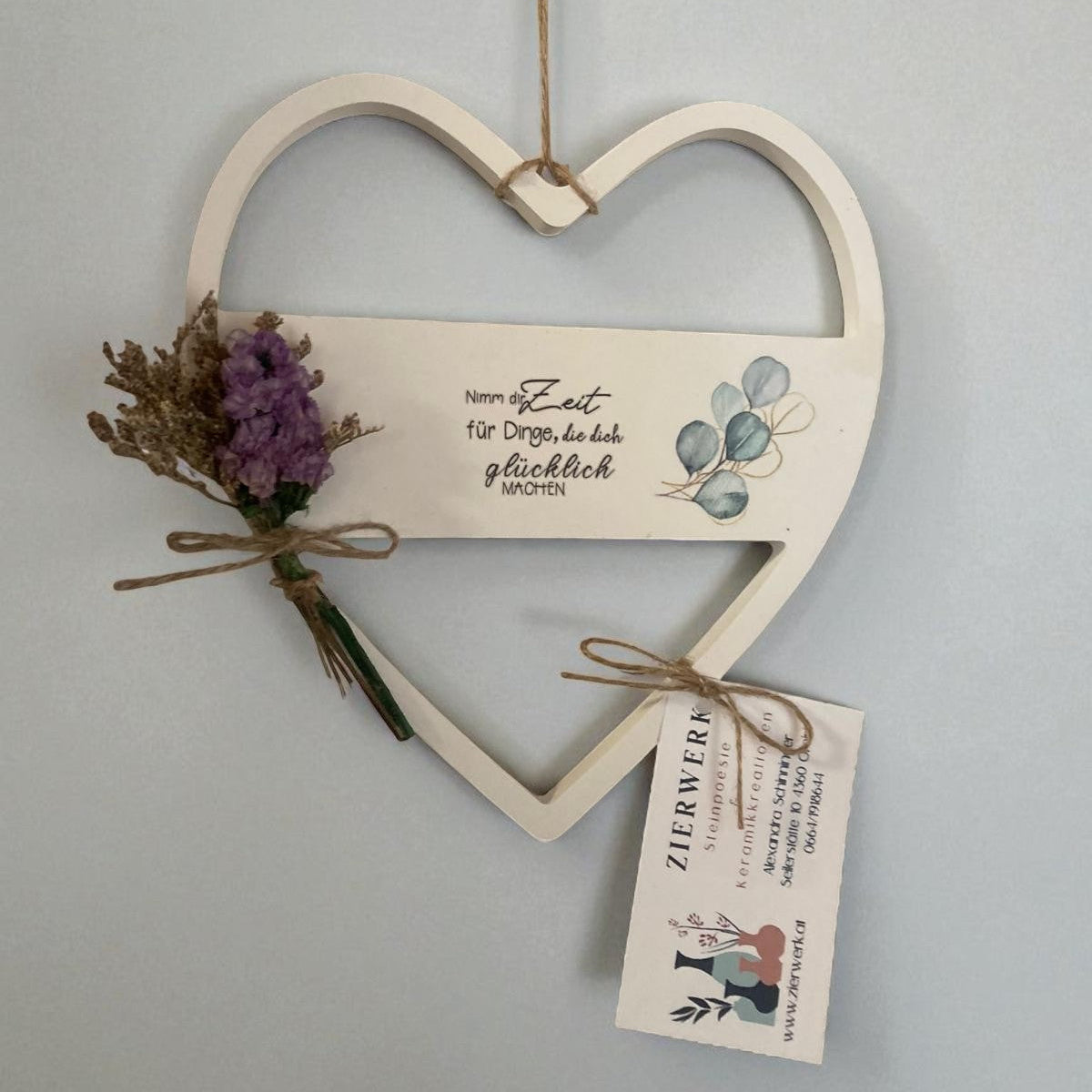 Mit einer zarten Trockenblumenverzierung und einem feinen Juteband zum Aufhängen fügt sich dieses Dekoherz harmonisch in jeden Wohnstil ein – ob Landhaus, Boho oder Modern.